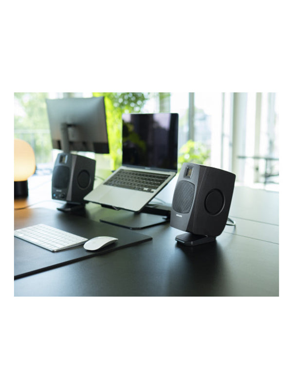 Le tweeter signature AMT est incorporé sous la forme d'un D-ART de 1,5'', pour le même rendu précis et sans fatigue des aigus qui ont fait la réputation de ces enceintes de monitoring. Le système de monitoring possède des commutateurs pour l'acoustique de la pièce fonctionnant avec un DSP, des supports de bureau et une embase pour pied de microphone de 3/8'' sur le dessous.