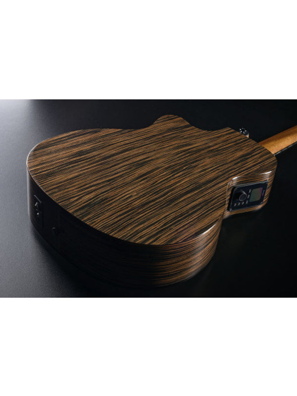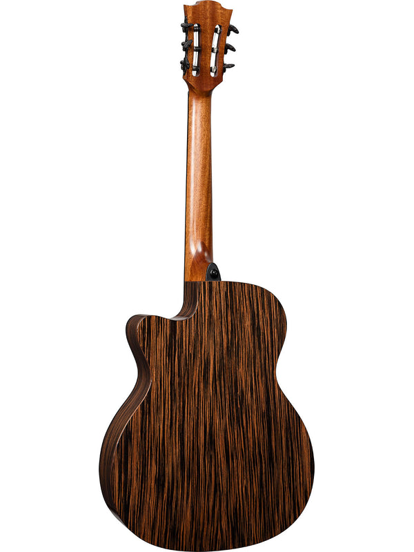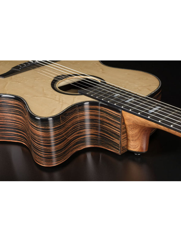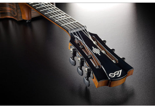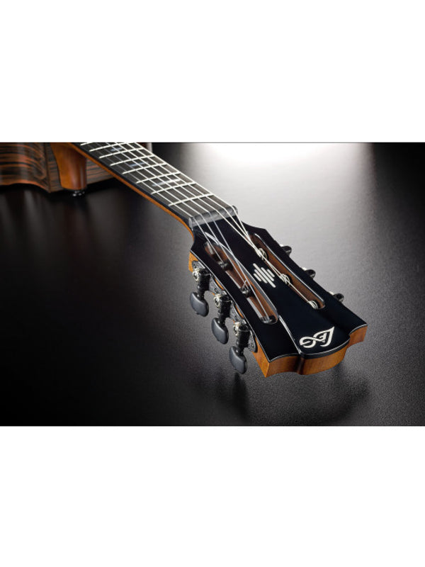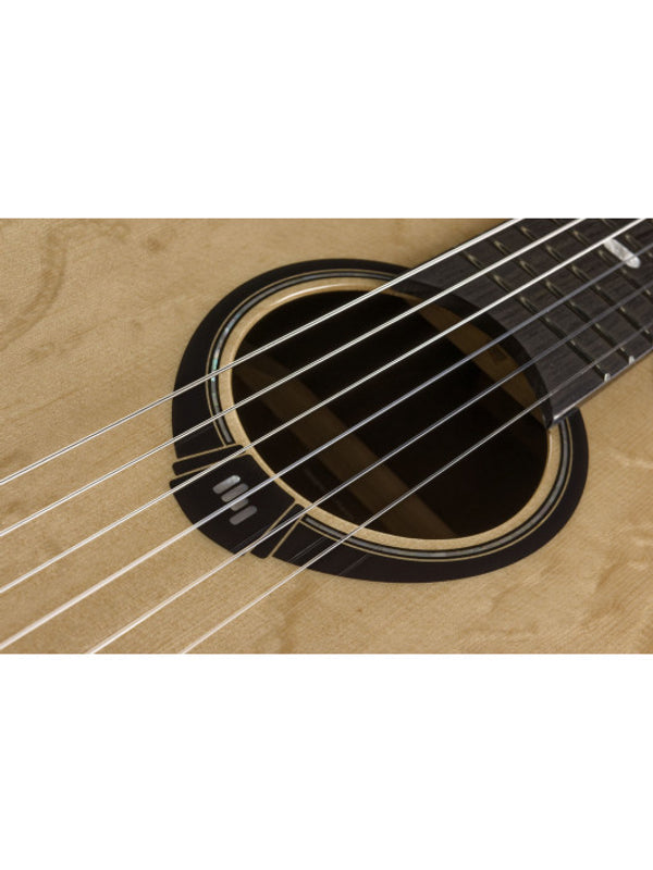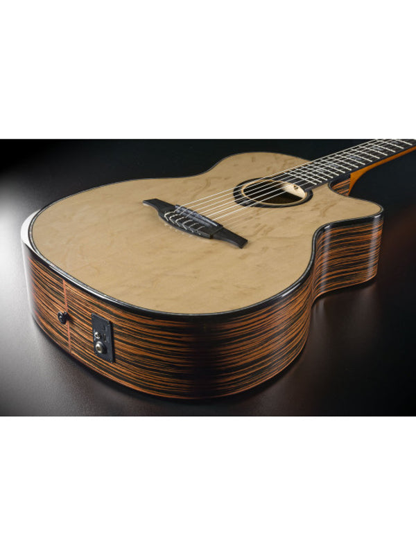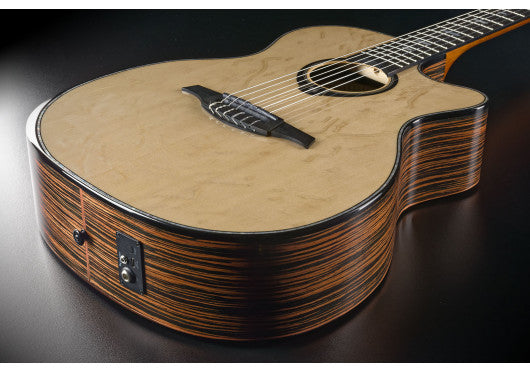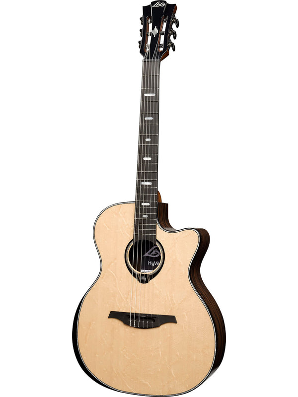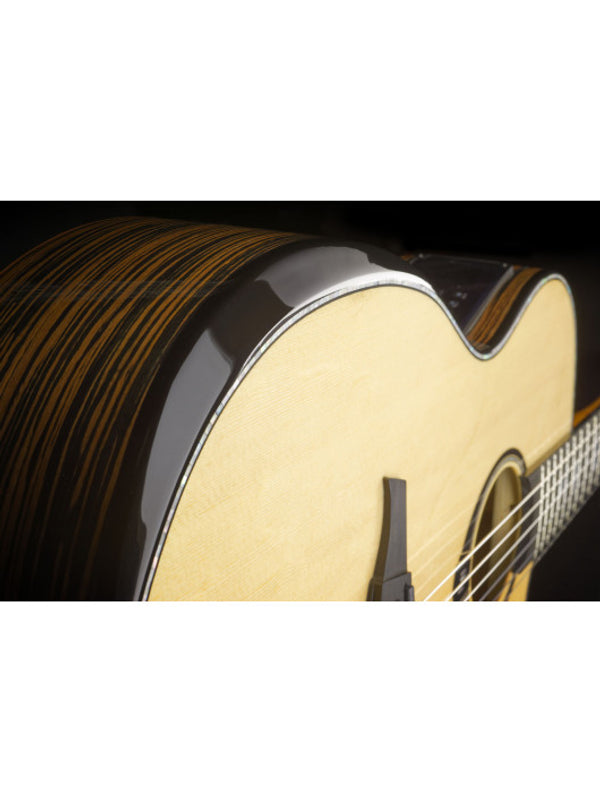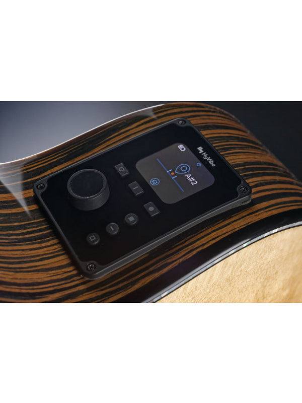 La HV50N-ACE réunit la douceur et la chaleur des cordes nylon avec une lutherie luxueuse et la puissance du système HyVibe. Sa table massive en épicéa Engelmann Bearclaw assure clarté et expressivité, tandis que le dos et les éclisses en ébène de Macassar ajoutent richesse tonale et élégance visuelle. Ce modèle de haut vol est complété par un bevel (chanfrein) venant casser l'angle de la caisse pour un confort optimal ainsi que des incrustations d'abalone sur les filets et la touche pour un rendu haut de gamme.