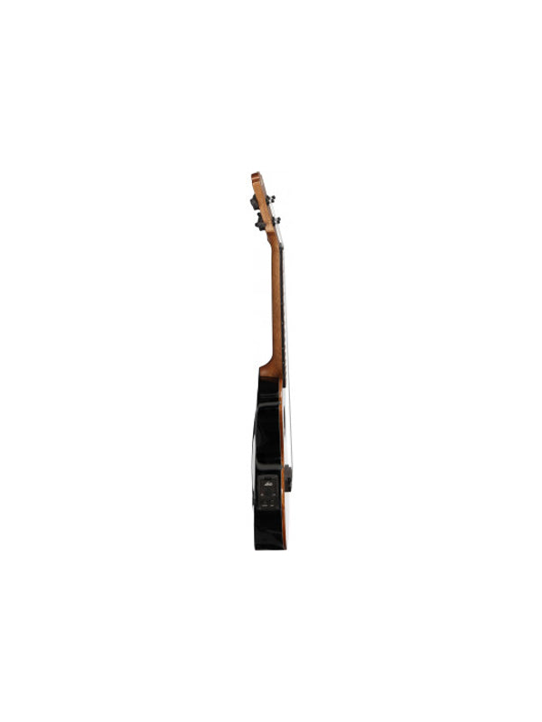La série Tiki 118 adopte un format slim avec dos bombé pour un confort de jeu optimal et une projection acoustique renforcée. Compact et ergonomique, cet instrument se joue aussi bien à la maison qu’en déplacement ou sur scène, tout en délivrant un son étonnamment puissant. Sa table en cèdre rouge massif apporte chaleur et sensibilité, complétée par un corps en sapelli au timbre rond et équilibré. Le chevalet en noyer et les mécaniques à bain d’huile assurent une excellente stabilité d’accord. Côté esthétique, la finition noire brillante s’allie à des bindings acajou et incrustations érable, avec une rosace inspirée de l’art polynésien pour une identité unique. Enfin, le préampli LÂG discret avec accordeur intégré et réglages complets garantit une utilisation simple et efficace en studio comme sur scène.