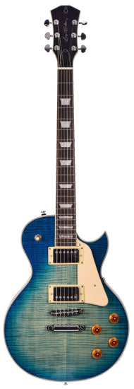 L7 TBL Corps en Acajou/érable massif et veines flamées, Format: Lespaul, manche acajou, forme en C, diapason: 27'4”, touche en ébene (Radius : 12"), Frets: 2,7 medium Jumbo, sillet: 43mm, Binding : ivoire , Incrustations nacrées,Capteurs 2 micros double bobinage chromés (Alnico5), Contrôles : 2 Volumes, 2 Tonalités (Chaque micro) selecteur 3 positions, Chevalet : Tune-O-matic & cordier en aluminium, Mécanique: Capot Premium Autobloquante (Chrome), Pickguard : ivoire, Finition Transparent blue burst.