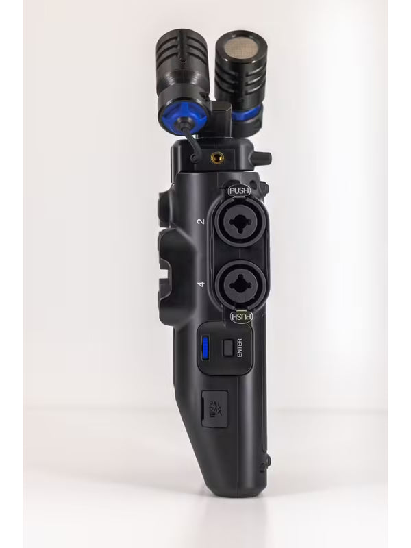 - Livré avec capsule XYH-5e : 2 micros à condensateur 19.4mm en configuration X/Y à 90°, jusqu’à 140 dB SPL (-41 dB/Pa@1 kHz) + entrée latérale Mic/Line sur mini-jack 3,5mm supportant l’alimentation PiP pour les microphones lavalier
